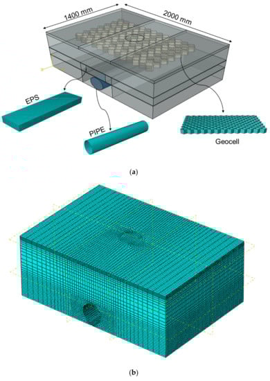 Precise 3D models representing the true experimental conditions and dimensions were created and meshed as shown in Figure 7. A total of 94,928 hexahedral linear elements with reduced integration formulation (C3D8R) were used for the soil. The elements around the surface loading and pipe were meshed with high density to enable the computation of extensive deformations and to guarantee more accurate results. Since the maximum settlement occurs near the trench surface, this strategy is implemented near the trench surface to increase the accuracy of the results. In addition, the geocell was modeled with a total of 8160 linear membrane elements (M3D4R). Since embedded interaction provides a situation in which the host region and embedded structure act as a single unit, embedded interaction was employed between the soil and the geocell. The pipe was modeled with a total of 2730 elements with linear four-node shell elements (S4R), and EPS blocks, like the soil, were modeled by hexahedral linear elements with reduced integration formulation (C3D8R). The frictional coefficient between the EPS block with trench soils was considered to be 0.6 [35]. The friction angle value between the pipe and the soil was set to half of the peak frictional angle of the soil [36]. In order to simulate the real situation, the boundary conditions for both experimental study and numerical study were modeled based on a continuous pipeline which needs fixed horizontal conditions.