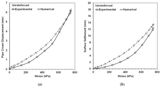 Verification of the experimental test in the unreinforced condition: (a) the maximum pipe crown displacement, (b) the maximum soil surface settlement under the imposed load.