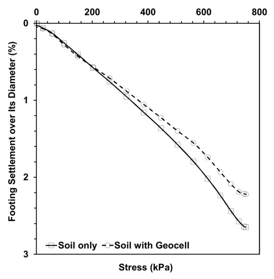 In this section, a basis of numerical analyses by verification of two experimental analyses is presented. The explicit solver was selected for scrutinizing the system and obtaining the results. The explicit method provides accurate results if the parameters are chosen exactly and if a practical system with high calculation ability (i.e., able to solve problems in a sensible running time) is employed. Gravity was implemented, as well as surface loading, to give more accurate results. Figure 8 shows the verification of the experimental test in which the combined behavior of the soil and the pipe against the applied stress was examined. The results of the numerical analysis show a slight discrepancy from the experimental results. Because of this difference, the behavior of the EPS block (density 30 kg/m3) was investigated. The results of this analysis show a similar trend to the experimental results (Figure 9). These results show that the numerical procedure, parameters, and behavior of the materials are reliable. It is clear that the mentioned discrepancy is comparable based on experimental and numerical results considering inhomogeneous materials and error in experimental analyses derived from measuring instruments and operator errors. For validation, a geocell with the characteristics given in Table 1 was overlaid at the optimum depth (u= 50 mm) and width (1400 mm) advised by Moghaddas Tafreshi and Dawson, 2010 [37], and embedded in the solo soil trench that was lacking a pipe and other reinforcing materials and had the same dimensions as in the experimental tests. In the geocell reinforced test, the geocell pocket sizes were 110 × 110 mm2 with a height (hg) of 100 mm. The imposed load over the trench without any reinforcing element and pipe had the same values as utilized in all the numerical and experimental analyses. The trend of this verification is similar to that obtained by other researchers [12] when the implemented geocell and soil have the same stiffness (Figure 10).