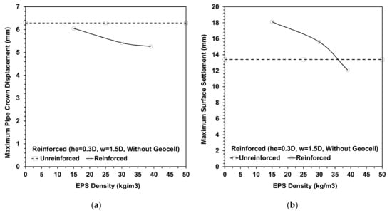 Effect of EPS density on behavior of (a) pipe crown displacement, (b) soil surface settlement under the imposed load.