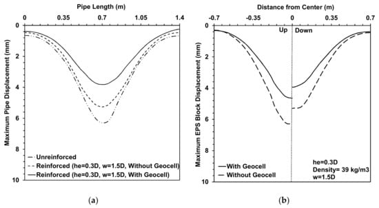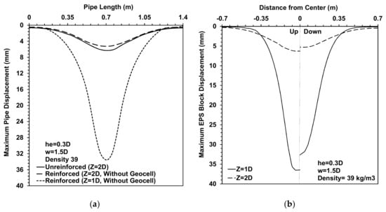 One of the pivotal points in implementing EPS in a project is the design of the stress over the embedded EPS geofoam blocks. Many regulations suggest using a concrete slab over the buried EPS blocks [38,39,40]. With this in mind, we implemented the best result of our analyses with the pipe burial depth of D rather than 2D (he = 0.3D, w = 1.5D, and density 39). Figure 12a shows the maximum crown displacement values over the pipe length in which the maximum displacement increased from 5.26 mm to about 33 mm by decreasing the burial depth to 1D. In Figure 12b, the maximum deformations in the top and bottom faces of EPS blocks are over their lengths, and the figure shows the EPS block faces deformation increased on average by 28 mm by decreasing the depth of the pipe from 2D to 1D. For clarification, it should be mentioned that by decreasing the depth to 1D, the pipe in the unreinforced condition fails under the huge deformation. When EPS blocks are implemented over buried pipes, the maximum soil surface settlement increases from 12.09 to 38 mm by decreasing the burial depth from 2D to 1D. From these results, it is clear that the depth of the pipelines and EPS blocks have significant effects on complex pipe systems.