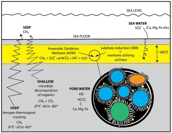 Processes involved in the formation of methane-derived authigenic carbonate (MDAC) and pyrites. Note δ13C values for methane source from [], * Vigneron et al. [] put the boundary between thermogenic and microbial methane generation at −50 ∂13C. Blue = quartz grains, orange = carbonate grains, green = feldspar grains, yellow = pyrite framboids, white = acicular aragonite. SMTZ = Sulphate-Methane Transition Zone.