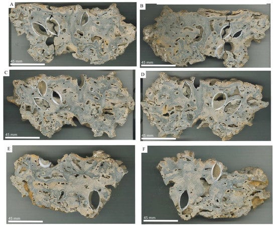 A single block of Quaternary methane-derived authigenic carbonate (MDAC) was collected by divers, from the seafloor near Rathlin Island, County Antrim, Northern Ireland. The block was slabbed using a diamond thin sectioning saw and optically imaged (Figure 2). Some of the material was resin impregnated and made into polished thin sections. The latter, along with smaller broken surfaces were additionally imaged using a Quanta 650 FEG scanning electron microscope (SEM) (Thermo-Fisher Scientific, Waltham, Massachusetts, USA). Samples were examined uncoated and imaged in low vacuum mode utilising backscattered electrons (BSE), with both single images and larger scale montages collected []. Biogenic components and aragonite cement samples were analysed for δ13C and δ18O isotopes (Scottish Universities Environmental Research Centre (SUERC), East Kilbride), using a VG SIRA 2 triple collector, dual inlet isotope ratio mass spectrometer (VG Instruments, Crawley, West Sussex, UK): for information on the technique see Mitchell et al. [], Parkinson et al. []. X-ray diffraction (XRD) analysis was also carried out (University of the West of Scotland) for carbonate mineralogy, using a Seimens D5000 X-ray powder diffraction system (Bruker Corporation, Billerica, Massachusetts, USA). A 25 mm core plug was also scanned by X-ray tomography (XRT) using an RX Easy Tom ET150 (RX Solutions, Annecy, France), for porosity, and a portable TinyPerm permeameter (New England Research Inc., White River Junction, VT, USA) was used to collect permeability data. In addition, ImageJ (open source software, Wayne Rasband, National Institutes of Health, Bethesda, MD, USA) and pore analysis tools (PAT) (Heriot-Watt University, Edinburgh, Scotland) were used to assess porosity and permeability.