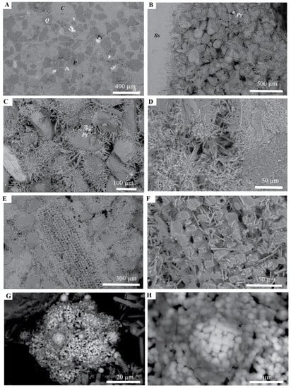 Backscattered electron (BSE) micrographs of hardground features and fabric. (A) Highly carbonate cemented area of matrix. C = carbonate particle, Q = quartz, Py = pyrite and P = more porous area, with less cement. (B–D) Increasing magnification views of typical areas with aragonite acicular cement. In (B), the left-hand side illustrates bivalve shell, with aragonite fringe. (E,F) Carbonate particle (echinoderm spine), with aragonite fringe. (G,H) Details of pyrite framboids, associated with organic material (darker grey).