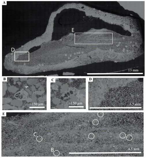 Composition (X-ray diffraction (XRD)), ∂13C ‰ V-PDB, ∂18O ‰ V-PDB and temperature, for biological calcite and aragonite cement from the Rathlin sample. Analytical precision ± 0.1‰. Temperature calculated based on Epstein et al. []: T = 16.5−4.3 δ + 0.14 δ2; T = temperature in ˚C, and δ = δ18O for calcite. Key: low magnesium calcite (LMC), high magnesium calcite (HMC), indeterminate (INDET).