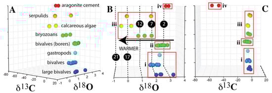 Plots of δ18O and δ13C values, for materials measured during the current study. (A) Three-dimensional plot of δ13C versus δ18O, divided into individual specimen types along the z-axis, (B) as in (A) rotated to clearly display differences in δ18O between groups, (C) as in (B) but to show δ13C. Key: (i) pre-hardground fauna (bivalves and gastropods); (ii) post-hardground “boring” bivalve fauna, or co-occuring bivalve fauna associated with hardground cementation; (iii) late developing encrusters (bryozoan, encrusting calcareous algae, serpulid tubes); (iv) aragonite needle-like cement. Figures in black circles = T °C after Epstein et al. []. Note vertical axis only used to separate the different tested groups, no scale. Temperature values for aragonite cement are not likely to be accurate (see Section 4.2.1).