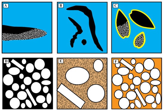 Schematic cartoons of the variability in porosity. (A–C) macro-porosity, from (A) Horizontal burrows (Thalassinoides), (B) variably shaped/oriented borings, (C) porosity within bivalves. (D–F) variability in micro-porosity, with end members of (D) no cement, inter-particle porosity well-developed, (F) up to 100% cement, no inter-particle porosity; (E) partially cemented with bladed and acicular aragonite, resulting in complex irregular inter-crystalline porosity. Note that blue areas of matrix in (A–C) are often well-cemented as in (F), while sediment within macro pores illustrated in (A–C), typically have porosity as in (D,E), with thin well cemented laminae (F) (Figure 4e). Additionally, burrows often surrounded/demarcated by pore-occluding cement, as in (F).