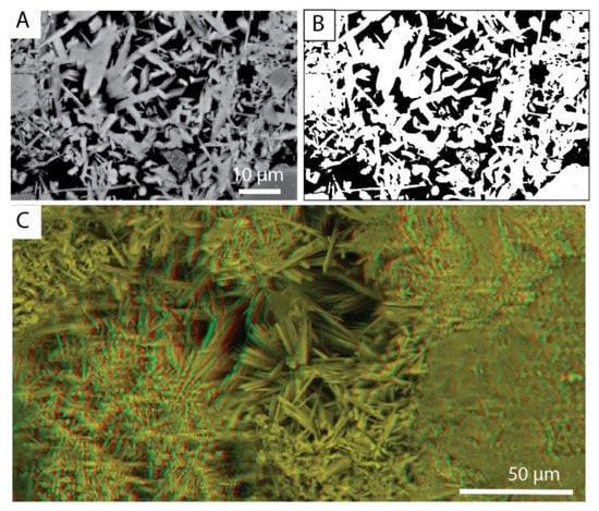 Illustration of complex pore morphology associated with acicular cements. (A) Scanning electron microscope (SEM) image, (B) binarised image of (A) for porosity (black), porosity = 62%, signifying that much of the pore space is open, but highly compartmentalised and baffled. Pores are difficult to model in terms of permeability using digital rock modelling (DRM) techniques, as they do not conform to the standard spherical pore models commonly used. (C) Three-dimensional stereo image, illustrating the complexity of pore spaces in three dimensions (requires green-red stereo glasses).