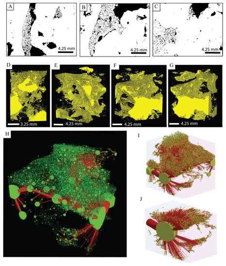 (A–C) Binarised slices through X-ray tomographic reconstruction of the Rathlin sample, black = pores, white = solid. Images 1341 by 1020 pixels, ~13 µm per pixel. (D–G) 3D reconstructions of porosity (yellow), at various rotations, from the same scan as in (A–C). Full movie of 3D reconstruction available in Supplementary Materials. (H–J) Ball and stick models of pore connectivity used to model permeability; balls representing pores, and sticks pore throats, with size indicating relative size. (H,I) overviews of whole sample at different orientations, (J) enlargement of (I) illustrating connection of small pores to the larger pore system.