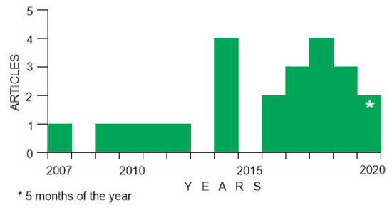 The research in geoheritage and climbing activities has remained relatively weak, but its spatio-temporal patterns imply its persistence in the international agenda for an extended period. The first articles exploring this subject appeared in the end-2000s, and their number has increased since the mid-2010s (Figure 1). Most probably, this can be explained by the rise of the geoheritage studies focusing on very particular aspects of geoheritage, as well as on its application to education, tourism, well-being, etc. In other words, the rise of the reviewed research was triggered by the geoheritage interpretation of societal needs.