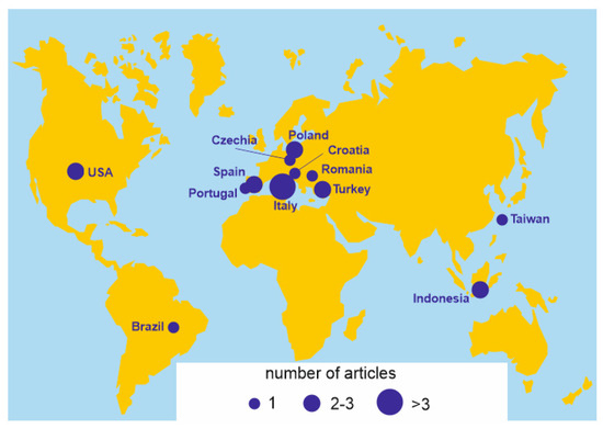 Principally, the geographical patterns of the research in geoheritage and climbing activities can be documented with two approaches, i.e., by the author countries (the countries represented by the authors of the considered sources) and by the focus countries (the countries on which the considered sources are focused). Interestingly, the author countries and the focus countries coincide in all cases, with one exception (Table 1). Generally, the research on geoheritage and climbing activities tends to concentrate in Europe (Figure 2). The most studied are the European Mediterranean countries and East European countries, and significant emphasis is placed on the Italian localities (Table 1). The sources considered for the purposes of the present study also represent the Americas and Southeast Asia, but with only very few countries. Although the geological knowledge provided in the reviewed work is heterogeneous and it would be highly challenging to summarize it, the localities considered by previous researchers (Table 1) represent very distinct geological and geomorphological domains. Nonetheless, the number of works is too small to judge this entity of the literature comprehensive or even representative in regard to the geological/geomorphological environments.