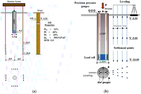 Components of the reaction system used in the large-diameter pile-loading test are given in Figure 1a. The system consisted of steel girders held by 20.0 m length of burden anchors. In order to ascertain that anchors’ positions would not affect the pile-bearing and skin friction results, the compression anchors were allocated at a horizontal distance equals three times of pile diameter (4.0 m), from the pile central loading axis (Figure 1a). Also, the anchors were vertically extended to 15 to 20 m depth below the ground surface. Figure 1b presents the instrumentations and measuring devices that have been used in the loading test. Pile was equipped with an end bearing prefabricated concrete base containing a load cell to measure the transferred stresses at the pile base level. The load cell was placed immediately under the pile base. The difference between the load cell measurement and the applied load gave the transferred load by friction. In addition, ground settlement points with steel rods of 25 mm diameter have been used to measure the settlement of the soil near the pile. These settlement points were protected by plastic pipes and installed at a horizontal distance of 0.5 m, 1.0 m, 1.5 m, and 2.0 m from the pile’s shaft. Three different levels were assigned for the settlement points. These levels were −0.50 m below ground surface, at the middle of the pile length at the level of −5.00 m, and under the pile base at the level of −10.00 m (Figure 1b). Furthermore, pile settlement was measured using dial gauges at the head level and also monitored using a concreted precision leveling device.