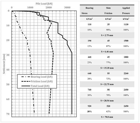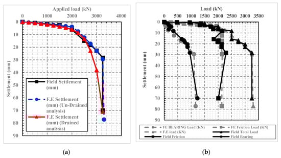 It can be seen from Figure 11b that good agreement is obtained between the undrained numerical results and the field measurements. Similar to the drained analysis results, the load is predominantly transferred by friction at the initial loads, and up to the working load of 1500 kN. Full mobilization of the friction resistance is achieved at an applied load of 2100 kN. After this load, the friction resistance becomes a constant value. In contrast, at higher loads, pile bearing resistance is obviously increased to achieve its maximum value at the load of 3250 kN. At a load of 3300 kN, a sudden substantial increase in pile settlement results, also a slight increase in the bearing resistance results is noted.