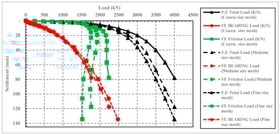 Figure 4 highlights the significant effect of mesh size on pile load settlement results. As shown, the pile settlement increases with decreasing mesh size, and the model with fine mesh achieved the highest settlement values. This comparison also shows that up to working load (1500 kN) minor effect of the mesh size was observed on the results of the pile load settlement. The same observation is also exhibited in the results of the total, bearing, and friction resistance. As shown in Figure 4, at the applied load of 1500 kN, almost equal values are obtained using the three numerical models with different mesh sizes, for both bearing and friction resistances.