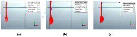 The mesh size also has a significant effect on the pile failure mechanism, as demonstrated in Figure 5. The formed plastic points under the last load increment are more dense and smooth in the fine mesh model results (Figure 5c) compared to the results of the coarse mesh model (Figure 5a).
