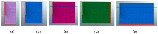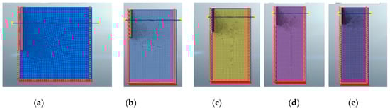 Five finite element models with different widths. (a) 10 m × 16 m, (b) 15 m × 16 m, (c) 20 m × 16 m, (d) 25 m × 16 m, (e) 30 m × 16 m.