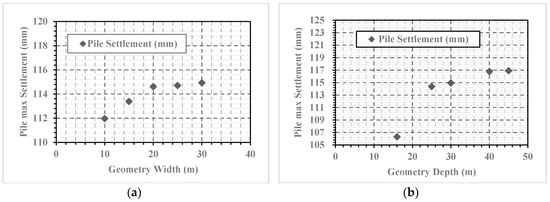 Relations between maximum obtained pile settlement and model geometry. (a) Model geometry width. (b) Model geometry depth.