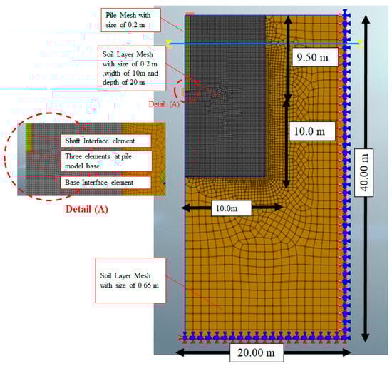Based on the sensitivity analyses performed, the numerical model shown in Figure 9 has been established. To satisfy both the accuracy of the results and the analysis time requirements, a compromise solution has been adopted as follows. A fine mesh with a size of 0.216 m was considered around and below the pile element (10 m width and 19.5 m depth), and gradually, soil mesh size is increased to be 0.65 m at the boundary locations.