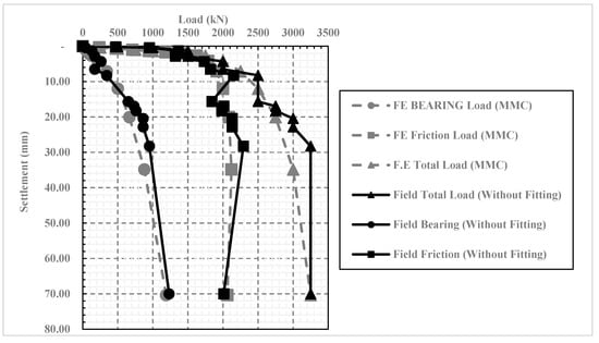 Fundamental to note that in this evaluation, the finite element analysis criteria mainly aspires to achieve the failure load by applying load with a value greater than the ultimate load measured in the field study [12], to allow the finite element solver to achieve the failure according to the employed convergence criteria. The maximum load where convergence can be obtained in the numerical model is considered as the failure load. Furthermore, failure is also indicated by the apparent large settlement that is expected to be induced at the ultimate load, similar to the field-loading test results.