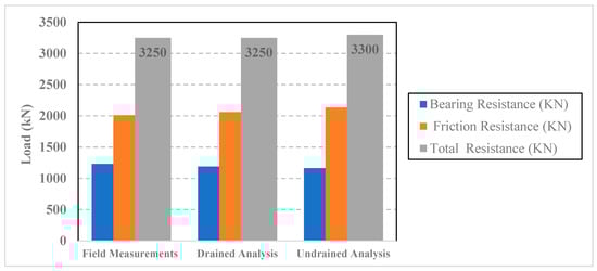 Figure 12 shows a comparison between field measurements, drained, and undrained analysis results of the total, friction, and bearing resistances. Good agreement is obtained between field measurements and both drained and undrained analyses result at the ultimate state, when a reduction factor of 0.36 and 1.0 are adopted in undrained and drained analyses, respectively. However, the obtained ultimate capacity from undrained analysis (3300 kN) is slightly higher than that obtained from the drained analysis (3250 kN).