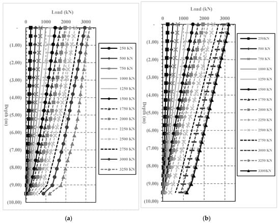 Figure 13a,b present the axial load distribution along pile shaft length for both drained and undrained analyses, respectively. Pile axial load distribution is calculated at each loading increment by multiplying the normal vertical stress in the shaft times the pile cross-sectional area. Worthwhile noting that pile load values at the base level are calculated by the integration of bearing stresses at the pile base.