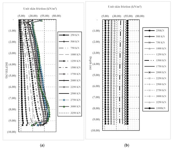 Tangential stresses of the interface elements in the vertical direction (Y-Axis) are obtained from the calibrated numerical models at each load increment along the interface length. The relations between interface tangential stresses and pile length are presented in Figure 14a,b for both drained and undrained analyses, respectively. These tangential stresses represent the distribution of the soil unit skin friction along the pile shaft length at each load increment. In general, skin friction results are consistent with the result of pile load distribution (Figure 13), and indeed the obtained skin friction values are increased with the depth in the drained condition, and also they are constant with the depth in the undrained condition.