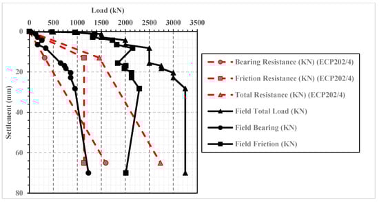 Fundamental to note that the ECP method did not consider any effect for the cohesive soil type, class, or degree of consolidation on the suggested undrained bearing stresses values. Besides, these suggested values are recommended for any large diameter bored pile, whatever its diameter. Subsequently, the relations between pile settlement, friction load, bearing load, and total ultimate load are plotted and compared with the field measurements in Figure 15.
