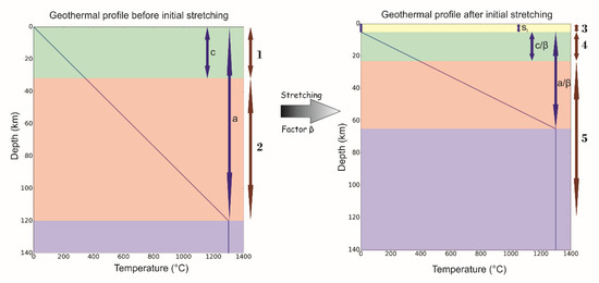 where and are thickness of crust and lithosphere, respectively, prior to stretching. The stretching factor is defined to be the pre-stretched lithosphere thickness divided by the post initial stretching lithospheric thickness. The left hand-side of Equation (3) represents the pressure at the boundary of lithosphere and asthenosphere at depth before stretching. The temperature dependence of crust and mantle is based on thermal profile , which is the thermal gradient at undisturbed state prior to stretching Equation (5). The right hand-side of Equation (3) denotes the pressure after uniform instantaneous stretching. The thermal gradient at this state is for density estimation of the crust and mantle. The integrals terms of Equation (3) are shown in Figure 1 for visualisation. Replacing the density terms in Equation (3) from Equations (1) and (2) gives the following: