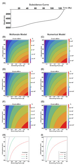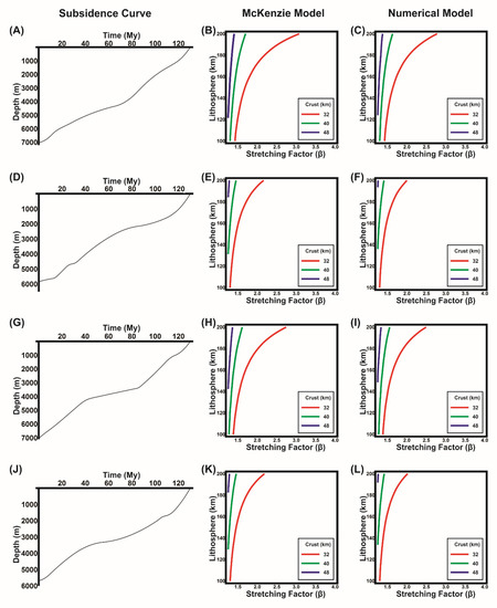 Furthermore, four synthetic subsidence curves are generated (see Figure 4A,D,G,J) and their subsidence history is compared for the models. The summary of best fit zero curve of values for both models for each synthetic curve is shown in Figure 4. It is worth noting that, with the same lithospheric thickness, a higher value of stretching factor is required for fitting the subsidence curve. This is because of the effect of sediments considered during the thermal cooling stage and the different crustal and mantle density considered in the numerical model compared with the McKenzie model.