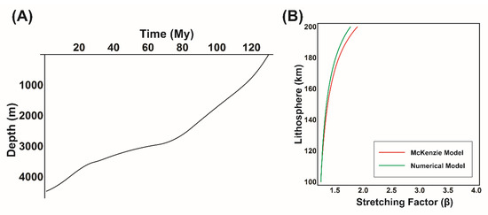 The subsidence rate for the depo-centre of the Campos basin was recently estimated by a study using backstripping and an inverse numerical modelling method [25]. This subsidence rate is used in this study to compare with the thermo-tectonic subsidence generated by the McKenzie model and the numerical model introduced in this study (see Figure 5A). The initial crustal thickness used for forward basin modelling is 32 km based on the result of deep seismic survey in the onshore region [28]. From the same study, values of sediment, crustal, and mantle density were used as 2300 kg/m3, 2800 kg/m3, and 3300 kg/m3, respectively. The constants for thermal expansion and thermal diffusivity are used as 3.28 × 10−5/°C and 10−6 m2/sec, respectively.