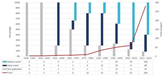 All of the papers were evaluated in such a way as to rate them as shallow-water (depth < 200 m), deep-water (>200 m), or not applicable (e.g., bibliographic review and methodological development). The graph (Figure 2) presents it in terms of percentages.