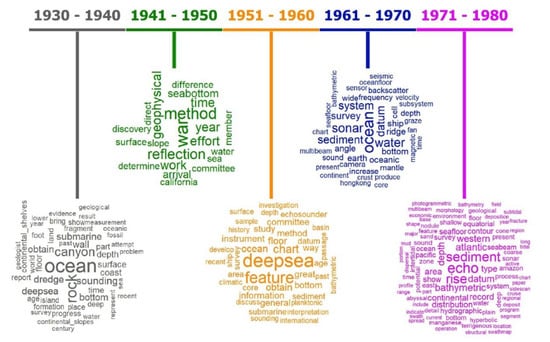For the decade of 1971–1980, the most recurrent terms were “echo”, “rise”, and “sediment”. The highlight of “echo” was driven by an echo character study of the Atlantic floor [40]. The occurrence of words such “deep” and “abyssal” support the predominance of works in deep-water shown in Figure 2. Furthermore, the term “Seabeam” is from the first multibeam system used for non-military purposes, during the N.O. Jean Charcot expedition.