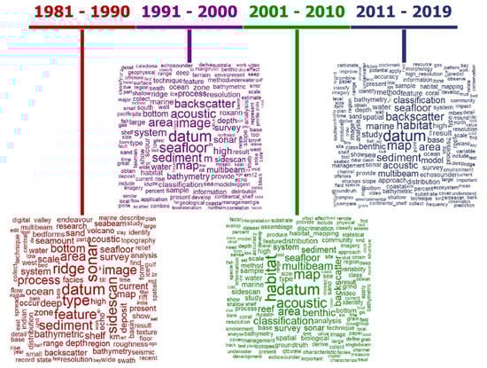 In the following subsections, we will present and discuss the obtained results qualitatively and quantitatively. The results were divided into three major topics. For the first topic, a temporal analysis was conducted over the decades using primarily word clouds and attempted to separate them between deep- and shallow-water contexts. The second topic addresses the similarity analysis for the two last decades, a timeframe chosen because of the coexistence of numerous technologies for mapping, as well as different approaches and classification techniques [28]. In addition, due to the large number of papers analyzed for the 2011–2019 period (280 papers), word clouds for each year were created to obtain a better visualization with more details. The third topic discusses the importance, applicability and future directions of seabed mapping.