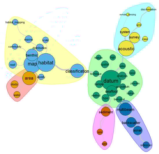 For the current decade, the similarity graph presented some changes (Figure 7). Based on this clustering, it is possible to observe “datum” playing a central role, which is coherent with technological advances and the increasing availability of data. In such a context, it is also possible to infer an even greater importance of multibeam and backscatter data. In addition, an interesting outcome appeared with a branch cluster including terms such as “model”, “accuracy”, and “percent”.