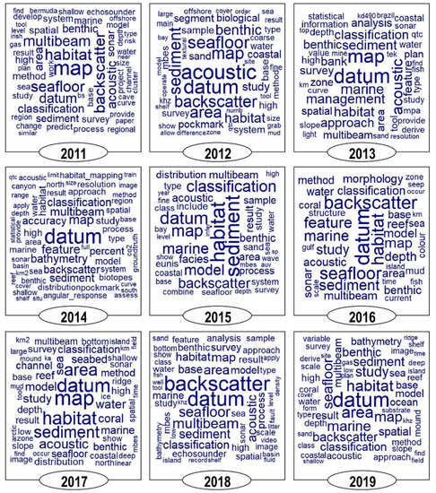 As expected, the term “datum” was always very present. Based on these word clouds for the last decade, it is also possible to note the almost ever-present word “classification” (exception in 2012). Indeed, the development of classification schemes, which are also related to the word “model”, is strongly associated with the development of classification and segmentation tools (several publications in a special edition of the Geosciences journal in 2017 were dedicated to a geomorphometric theme), such as BTM (Benthic Terrain Modeler), BRESS and RSobia, among other supervised and unsupervised methods. For the last several years, an increase occurred for “accuracy” (2016, 2017, 2018, and 2019), “repeatable” (2017, 2018, and 2019), “multispectral” (2017, 2018, and 2019) and “machine_learning” (2018 and 2019). Once again, “multibeam” and “backscatter”, as well the acronyms “mbes” and “bs”, are important terms and have been consolidated as the most useful data for classification and mapping the seabed [45,46]. Evidence of this is the special edition of the Marine Geophysical Research journal (2018) that was entirely dedicated to seafloor backscatter data.