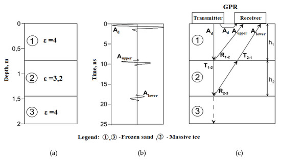 Ground-penetrating radar (GPR) model of frozen rock mass with massive ice (a,b) and a schematic diagram of the formation of reflected electromagnetic waves (c).