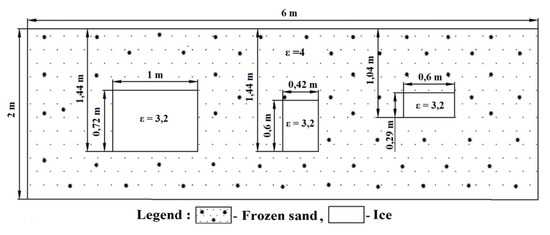 The GPR model (Figure 2) with three ice samples consists of a host medium represented by frozen sand, in which there are three rectangular ice blocks with a thickness of (h) 0.72, 0.6, and 0.29 m at a depth of 0.72, 0.84, and 0.75 m, respectively (the distance between the ice is 1 m). The thickness of the ice samples corresponds to the thicknesses of ice found in the permafrost zone. The electrophysical parameters of the objects are the same as for the GPR model of one sample (see above), the dispersion of electromagnetic waves in sand and ice was not taken into account. The wavelet shape was set using a Ricker pulse. The trace time for this model was 25 ns, the two-dimensional space discretization was set as dx = dy = 0.005 m. The source and receiver moved synchronously with a step of 0.03 m and the distance between them was 0.01 m. For more information on using gprMax, see at http://docs.gprmax.com/en/latest/index.html.