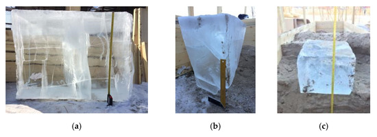 For the physical simulation of GPR location of the rock mass with the inclusion of massive ice and ice vein, an installation in the form of a wooden box was built. Ice models were formed from river ice. The dimensions of the first massive ice block: length—1 m, breadth—0.4 m, height—0.73 m (Figure 3a), vein ice: length—0.4 m, breadth—0.37 m, height 0.6 m (Figure 3b) and the second massive ice block: length—0.6 m, breadth—0.4 m, height—0.29 m (Figure 3c).