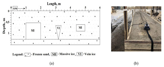 The installation with dimensions of 6 × 1 × 1.5 m: length—6 m, breadth—1 m, height—1.5 m was located on frozen ground. In the box was host rock, represented by frozen sand with a thickness of 1.25 m with the inclusion of river ice (Figure 4a). On the box, on the outside, marks were made indicating the size and position of the ice. The GPR sounding of the physical model of the frozen rock mass was carried out by two measurement methods—profiling and sounding (Figure 4b). During profiling, the GPR survey was carried out in a continuous mode, the GPR moved along the surface of frozen sand from one edge to the other. The movements of the GPR were recorded on the radargram by marks in accordance with the marks on the outside of the box, which made it possible to know exactly the location of the events of the signals reflected from the ice. When shooting according to the profiling technique, diffracted waves are formed on the radargram, which are reflected waves superimposed, changing their amplitude values. This effect is significant only for small objects compared to the wavelength emitted by GPR, however, to exclude this effect, a survey was also carried out using the sounding technique. In this case, the GPR was located on the surface of frozen sand directly above each ice sample to obtain a GPR trace without extraneous reflections.
