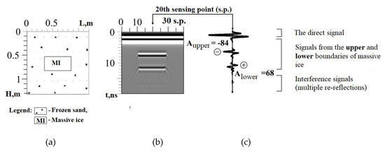 The GPR model of massive ice h = 0.29 m for AB-1200: (a) model of frozen rock mass (FR) with the inclusion of massive ice (MI); (b) radargram; (c) GPR trace.