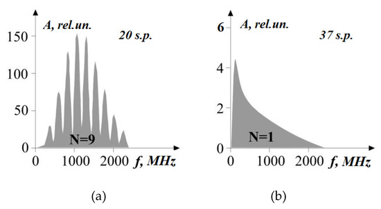 Figure 6 shows the Fourier spectra of the traces obtained in the areas with massive ice (Figure 6a) and without it (Figure 6b). The "ripple" shape of the first spectrum is explained by the fact that the ice acts as a comb filter k/Δt (where k = 0, 1, 2 ...), for frequencies multiple of 290 MHz. Since the frequency range in the spectrum is 2500 MHz, N = 2500/290 ≈ 9. In the absence of useful signals (37 s.p.), low-amplitude values with 1 maximum are observed on the Fourier spectrum of the GPR trace.