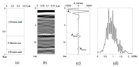 On the processed radargram of the massive ice model, the events of the direct signal and the signals reflected from the physical boundaries of the model layers are determined (Figure 10b). The average signal trace is shown in Figure 10c, on which the amplitude of the direct signal was Ad = −10,835 rel.un. with negative polarity. The signal received at the boundary 1–2 has an amplitude Aupper = −239 rel.un. (tupper = 8 ns) with the same polarity. At the border 2–3, a phase change of the reflected signal with an amplitude of Alower = + 140 rel.un. (tlower = 11.5 ns). Aupper/Alower = 0.6 < 0.953.5 = 0.83. The spectral characteristic of the processed radargram is presented in Figure 10d, which has a rather rugged shape.