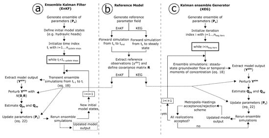 Figure 1 summarizes the forecast/update scheme of both ensemble Kalman-based methods presented. The steps to update the parameters with the EnKF are shown in column a of the figure, and the update scheme of the KEG is presented in column c. Column b refers to the general steps to generate a reference model, emphasizing that the same set of parameters are used for generating synthetic data with the two different numerical models applied in this work.