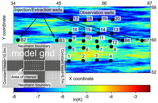 We generated the reference field of log-hydraulic conductivity in the area of interest (ln(K), Figure 2) using a spectral approach [], and a geostatistical model based on hydraulic conductivity values reported for the hydrogeological research site Lauswiesen (exponential model, mean hydraulic conductivity 3.0 × 10 ms, variance of ln(K) 1, and longitudinal and transverse correlation lengths 8 m and 1 m, respectively) []. All elements outside the area of interest were assigned a value equal to the mean ln(K) of the geostatistical model, and were treated as a single value during parameter updating, leading to a considerable reduction of matrix dimensions. The given transport parameters were also based on previous field investigations performed at the Lauswiesen site [,]. Storativity () and longitudinal dispersivity () were assumed homogeneous and equal to 3.5 × 10 m and 1 m, respectively. The dual-domain transport model was implemented with a mass transfer coefficient 1 × 10 s, immobile porosity of , and a porosity value for the mobile zone .