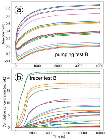 Synthetic drawdown (a) and cumulative breakthrough curves (b) for pumping and tracer test B, respectively.