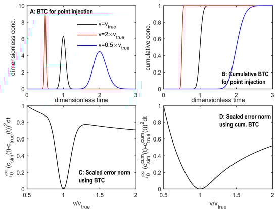 Sensitivity of a pulse-related breakthrough curve (A) and the corresponding time-integrated signal (B), with respect to groundwater velocity. (C): error norm as a function of velocity, between the reference and simulated breakthrough curves. (D): error norm as a function of velocity, between the reference and simulated cumulative breakthrough curves.