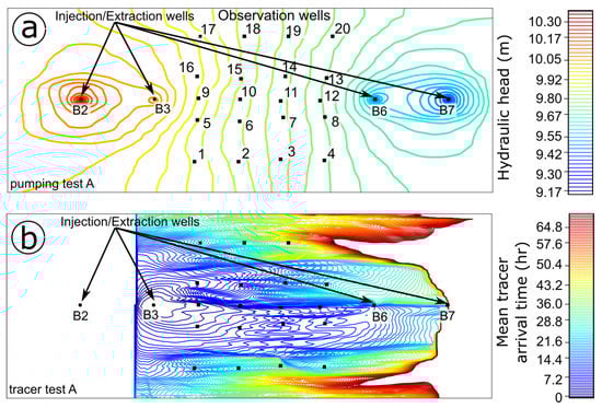Examples of the simulations performed with the steady-state groundwater flow model and temporal moments of tracer concentrations are shown in Figure 5, with the reference steady-state hydraulic head field (a) and the mean tracer arrival times distribution (b) for pumping and tracer test A, respectively. For tracer test A, we registered mean tracer arrival times of ~22 h and ~26 h at extraction wells B6 and B7, respectively, which are values similar to those obtained with the transient HydroGeoSphere model.