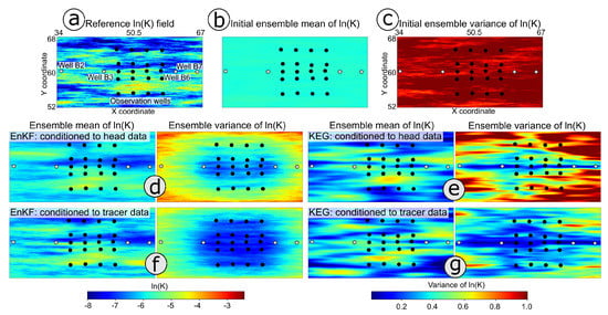 The bottom row in Figure 6 shows the estimated ensemble mean and associated variance of log-hydraulic conductivity after tracer data had been assimilated with the EnKF ( Figure 6f) and the KEG ( Figure 6g). The corresponding initial ensemble mean of log-hydraulic conductivity, that is, those conditioned to drawdown data, are presented in the middle row of Figure 6.