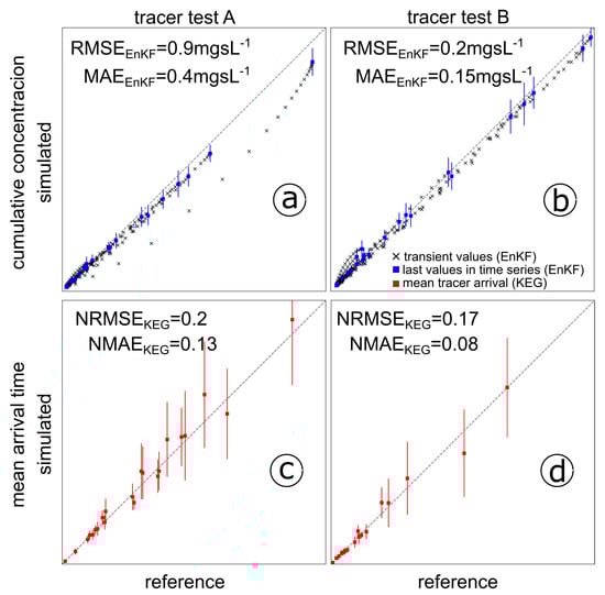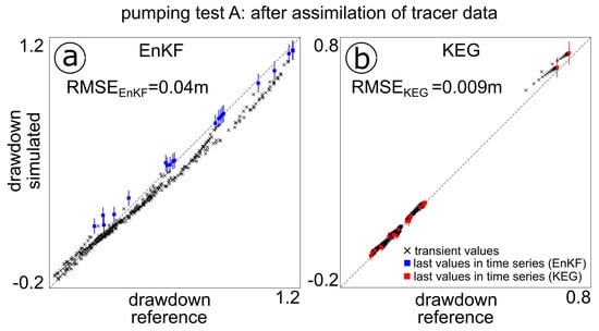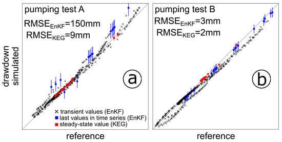 Figure 7 shows scatterplots of the ensemble-mean and spread of simulated drawdown versus the reference values computed at all observation points, for pumping tests A (Figure 7a) and B (Figure 7b). The transient drawdown records used by the EnKF are shown as black crosses and the steady-state values used by the KEG as red squares. To compare the performance of both methods at the end of the parameter updates, the blue squares in Figure 7 show the drawdown values simulated at the last assimilation time-step with the EnKF, which correspond to the steady-state drawdown values. The ensemble spread in the transient data is shown only for the last assimilation step (blue lines). The estimated root mean square errors were computed for the full transient data in the EnKF, and the steady-state hydraulic heads at the last KEG assimilation iteration.
