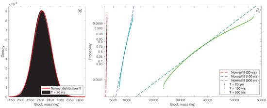 kg). The red curve is the normal distribution that best fits the obtained values. A good agreement between the real distribution of the masses at a given return period and a normal distribution is proven for other return periods, as shown in